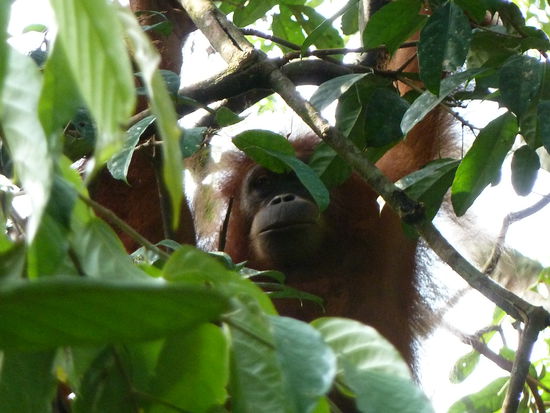 Dazu kam noch, das wir leichten Fehlinformationen unterlagen, was den Preis dieser Trecks anging, und deshalb viel zu wenig Geld hatten. Leider hat der einzige Automat, der 10 km entfernt war, auch nicht funktioniert, so dass wir uns ueberhaupt keine Dschungel Tour mehr leisten konnten, was wir zwar als schade ansahen, es uns aber eigentlich nicht sehr beruehrte, denn wir werden noch genug Dschungel Erfahrung in den naechsten Monaten machen. Also sind wir am naechsten Tag einfach in die Aufzuchtsstation der Orang-Utans gegangen, um zur Fuetterungszeit vor Ort zu sein. Gekommen ist leider nur ein einziger Affe, was ein bisschen schade war, denn von Berichten wussten wir, dass es in der Regel mehrere sind. Aber der war schon suess, waeren am liebsten zu ihm auf den Baum geklettert und uns umarmen lassen.
