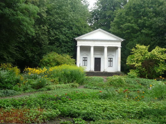 Im Schloss und Park Luisium war dringend eine Kaffeepause fällig. Schön, dass das nette Restaurant im Schloss geöffnet hatte und wir hier vor einem kurzen Regenschauer gastlichen Unterschlupf fanden. So konnten wir uns mit Kaffee und leckerem Kuchen stärken. Danach schaute auch schon wieder die Sonne hervor, so dass wir unseren Bummel vorbei am Schlangen- und Brunnenhaus trockenen Fußes fortsetzen konnten.
