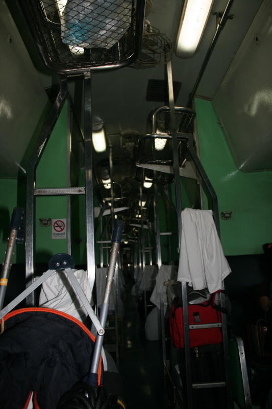 Dieser Nachtzug ist ne ganz prima Sache, die Sitze werden zu Betten ausgeklappt, Luki und ich konnten uns eine "Koje" teilen, er hat super geschlafen, ich habe die halbe Nacht dem rhytmischen Klappern der Bahn und den Dschungelgräuschen, die am (voll vergitterten) Fenster vorbeizogen.