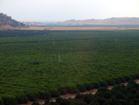 Wir fuhren zunächst durch die (Mojave) Wüste, dann durch die Wüste und anschließend durch die Wüste. Wenig Abwechslung. Mal ein Feld voller Photovoltaikmodule, dann kleinere landschaftliche Abwechslungen (Gebirge) mit Windkraftanlagen und plötzlich kam ein riesiges Tal. Alles flaches Land. Landwirtschaftlich genutzt. Die "Speisekammer Kaliforniens". Laut Reiseleitung erstreckt sich das Tal auf eine Länge von 600 Kilometer bei 60 Kilometern Breite. Angebaut wird scheinbar alles, Weintrauben, sonstiges Obst, Südfrüchte, Mais, Knoblauch!!! (hat sehr intensiv gerochen), Baumwolle,.... Nochmals: Keine Erhebung, nur flaches Land - scheinbar auch keine Steine.