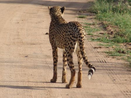 Nach einer Wegbiegung liegt ein Gepard auf der Strasse, wir können es fast nicht glauben, stellen sofort den Motor ab und betrachten das schöne Tier. Wir haben nie erwartet, dass wir einen Gepard in freier Wildbahn sehen werden!