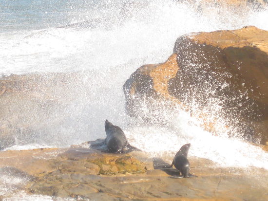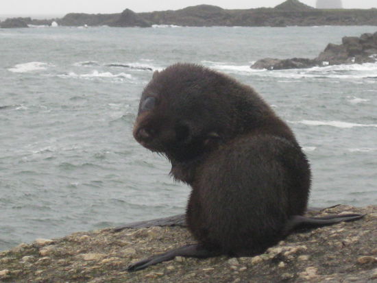 Da Martin und ich ja nicht umsonst zu Neuseelands Danger-Rangern und Gesetzesbrechern des Monats gewaehlt wurden, konnten wir uns diese Gelegenheit des hautnahen Kontaks zu wilden Tieren natuerlich nicht entgehen lassen und sind durch mannshohe Buesche und an "Hier nicht weiter gehen"-Schildern vorbei zu den Robben auf die Felsen geklettert, wo immer es Steinschlaege oder der gesunde Menschenverstand (also Zweiteres eher selten) es zugelassen haben.