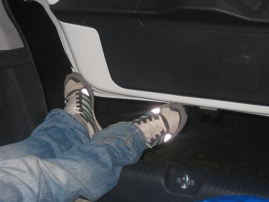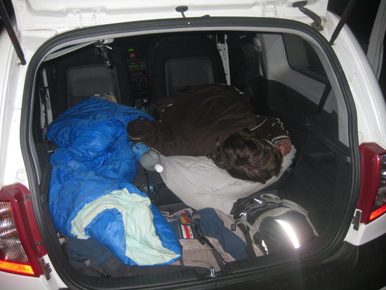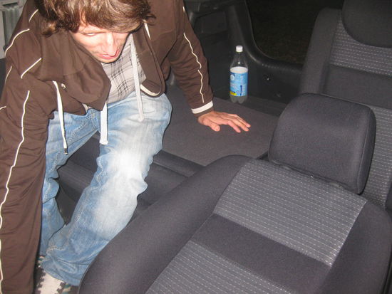 Zuerst muss man die Ruecksitze umklappen, damit man eine moeglichst gerade (falls ihr das zu Hause nachbauen wollt, denkt dran, dass ein umgeklappter Ruecksitz nicht im mathematischen Sinne "gerade" ist, sondern man muss sich beim Liegen eher auf einen Buckelwal einstellen) Flaeche vorfindet. Danach sollten die Vordersitze soweit wie moeglich nach vorne geschoben werden, was auf der Seite des Fahrers erhebliche Platzeinbussungen bedeuten kann...