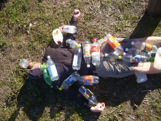 In unserem Experiment wurden vornehmlich Backpacker-Rucksaecke und die Kofferraum-Ablage als Schlafflaeche benutzt, doch der Loewenanteil des erstklassigen Komforts wurde durch taeglich gesammelte PET-Flaschen geleistet, die man praktisch willkuerlich unter dem schlafenden Koerper als Polsterung verteilen kann. In unserem Beispiel hat sich die Anzahl 27 Flaschen als extrem angenehm erwiesen...