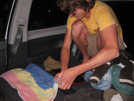 Dann sollte der deutlich tiefer gelegene Teil des Fussraums und des Kofferraums grosszuegig mit allem Auffindbaren ausgepolstert werden bzw. auf eine Hoehe mit der Schlafflaeche gebracht werden, um zu starkes Schief-Liegen zu vermeiden. In diesem Bild testet Martin fuer uns noch verschiedene Liege-Richtungen, wobei wir uns letztendlich fuer die Variante mit den Fuessen im Kofferraum entschieden haben als optimale Loesung...