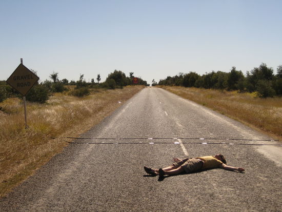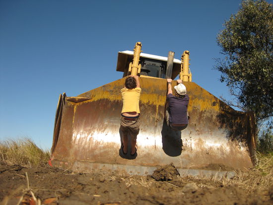 Und wenn man schonmal mitten im staubig-roten, gottverlassenen Outback einen verlassenen, ueberdimensionalen Schaufelbagger findet, na dann hat man doch als Hirnverbrannter nichts anderes zu tun, als sich den bereit liegenden Helm zu schnappen und den Traum eines jeden kleinen Jungen zu verwirklichen und Baggerfahrer zu spielen. Mit steckenden Schluesseln kommt die ganze Nummer auch irgendwie echter als mit Lego zu Hause