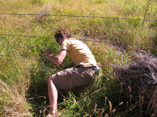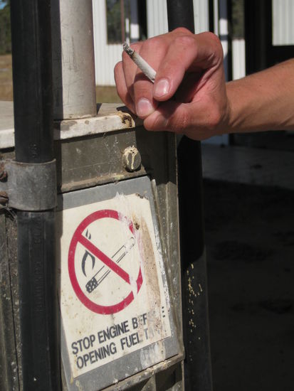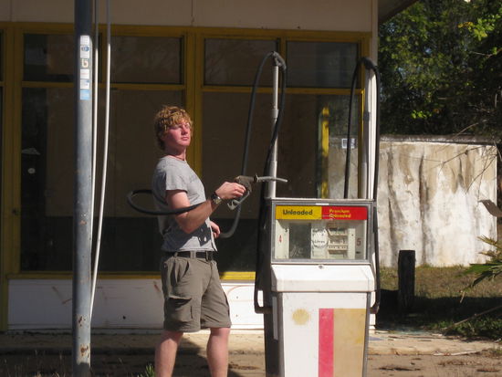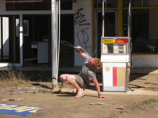 Tja und ein paar Tausend Kilometer weiter fanden wir dann eine noch trostlosere, so halb still gelegte Tankstelle, die durch einen gekonnten Schritt durch den Stacheldrahtzaun erreicht werden konnte. Hinter diesem Zaun befand sich das Paradies eines jeden Tankstellengeruch-Fetischisten wie mir: Zapfsaeulen ohne Ende und ein verlassenes, halb-zerfallenes Wohnhaus mit sehr interessanten Ecken und Reliquien dahinter. War wirklich aegerlich, dass wir erst nach dem Benzin-Bad gemerkt haben, dass die ganze Tankstelle von trockenem, huefthohen Steppengras umgeben war und wir einen staatenweiten Buschbrand ausgeloest haben. Wir wollten das aber ehrlich nicht!