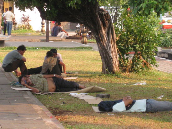 - heiss, heiss, heiss! Tagsueber gammelt alles so traege bei 30 Grad und gefuehlt 1000% Luftfeuchtigkeit dahin (weshalb auch die Haelfte der Bevoelkerung mit hochgezogenem T-Shirt irgendwo, wo Platz ist, n Nickerchen haelt, Muell daneben und unten drunter hin- oder her) und nachts? genau das Gleiche! immer noh 28 Grad, so dass man sich ehlendig einen abschwitzt und nachts nicht schlafen kann, obwohl der Zimmer-Ventilator auf volle Pulle laeuft, aber wenn halt nur heisse Luft zum Rumwirbeln da ist...