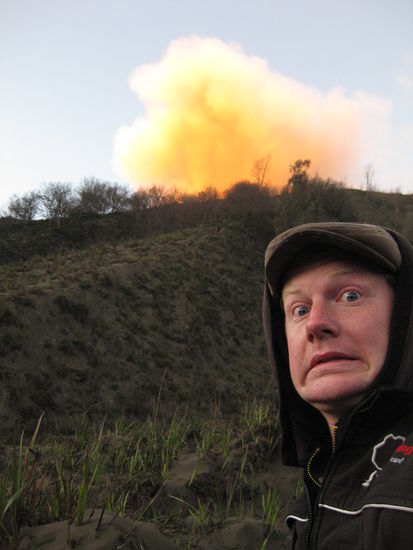 Also wieder runtergesurft durch den dicken Asche-Abhang und schoen mit Hunderten von hollaendischen Touris die Treppe nochmal rauf, um dann tatsaechlich DIREKT am Kraterrand zu stehen (hab mich ein bisschen gefuehlt wie in Star Wars 5 oder 6, wo Luke in der Wueste bei Jabba auf dem Sprungbrett ueber dem Loch steht, in dem ein Monster hungrig auf seine Mahlzeit wartet, falls irgendjemand auch nur entfernt weiss, was ich meine in meinem verqueren Kopf ). Den Vulkan hat das aber nicht weiter gestoert und er hat froehlich riesige Aschewolken ausgespien, die der Wind zum Glueck auf die andere Seite des Kraters geweht hat, so dass wir einen erstklassigen Blick auf einen frisch ausbrechenden Vulkan hatten! (und ich dachte damals nach 80 gestrandeten Stunden am Flughafen in Bangkok, dass ich fuer mein Leben genug haette von Aschewolken)