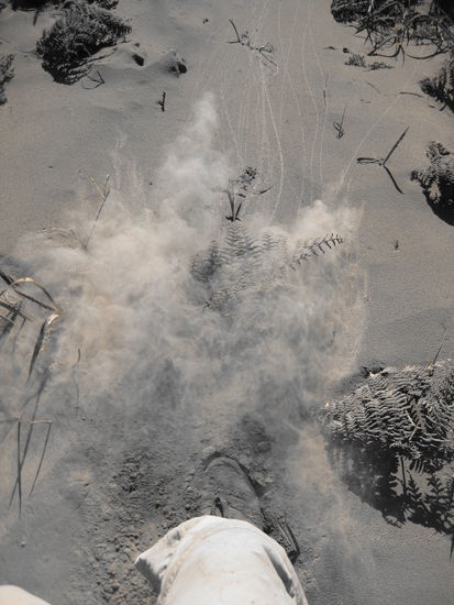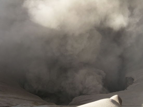 Von einer spontanen Hyperaktivitaet gepackt (die meine Freunde schon das ein oder andere Mal ganz gut genervt hat), bin ich den kleinen Huegel, auf dem ich mich niedergelassen hatte fuer mein deluxes Fruehstueck (eine Dose "baked beans", die ich aus Neuseeland-Zeiten noch in meiner Tasche gefunden hab und die auch kalt eine echte Delikatesse sind ) einfach mal hochkekrakselt und das ist wahrscheinlich genau der richtige Ausdruck fuer die Art, in der ich mich auf allen Vieren durch die dicke schwarze, staubige Asche den steilen Abhang hochgekaempft hab. Nach kurzer Zeit war ich voellig eingehuellt in eine grau-schwarze Ascheschicht und bin bei jedem schwerer werdenden Stolper-Schritt (denn auf 2600 m besteigt sich so ein bloeder Huegel doch nicht mehr so locker-leicht) knoechel-tief eingesunken. Doch schliesslich zaehlt die Mission!