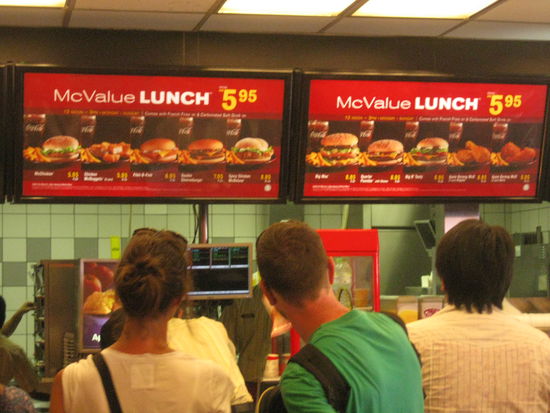 Aus medizinische fragwuerdiger Sicht bedeutet das 16,5 Stunden ohne Essen und Trinken auszukommen und das in einem Land, das gefuehlte 100 Luftfeuchtigkeit aufweist (schliesslich ist der Aequator nicht weit) und eine durchschnittliche Temepratur von 32 Grad laesst einen feinen Film von Sonnecreme und Schweiss auf der Haut glaenzen. Wie gerne wuerde man da eine kalte Cola trinken oder eine saftige Wassermelone von einem der tausend Fruchtstaende verschlingen! Da hier in dem Multi-Kulti-Hexenkessel Kuala Lumpur eben nicht nur Muslime wohnen, wird man praktisch an jeder Strassenecke hart auf die Probe gestellt. Denn staendig verhoehnen einen die Logos von McDonalds, KFC, Subway, BurgerKing, DominoPizza und ganz zu schweigen von den ganzen kleinen chinesischen Essenstaenden, die nur so duften von frisch frittiertem Zeugs yund frisch gepressten Fruchtshakes mit Einwuerfeln. Um sich einigermassen auf den Beinen halten zu koennen, nimmt man jede oeffentliche Toilette zum Erfrischen mit und klatscht sich dort soviel Wasser in Nacken und Gesicht, wie der Wasserhahn hergibt und spuelt sich begierig den ausgetrockneten Mund mit Wasser aus (ohne es runterzuschlucken allerdings!), waehrend ein paar Meter weiter genuesslich dampfende Burger gemampft und eiskalte Colas geschluerft werden und die Augen vor Neid ganz gross werden...