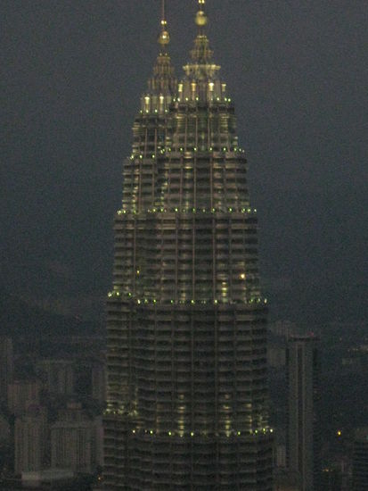 Trotz leerem Blick und schweren Beinen habe ich mich meinem derzeitigen Hauptberuf als Tourist verpflichtet gefuehlt und bin deshalb quer durch die Stadt gelaufen und habe mir die Highlights wie die 380 m hohen "Petronas Twin Towers" angeschaut. Ganz nett soweit, aber irgendwie auch nicht so besonders, wie man es von Bildern erwartet. Also bin ich zum zweiten touristischten Hoehepunkt der Stadt gelaufen: Dem 421m hohen Fernsehturm von Kuala Lumpur, der zusammen mit den Zwillingstuermen die Skyline sowohl bei Tag als auch bei Nacht bestimmt.