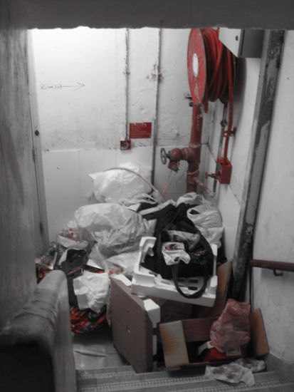 Es gibt zwar einen Aufzug ins Erdgeschoss, allerdings kommt der recht spaerlich bis in den 16.Stock und sobald man in der Eingangshalle ankommt, wird man auch zielsicher von einer Armada an schwarzen und indischen Typen belagert, die einem das tollste Hostel, die beste Uhr oder die coolste Sonnebrille der Stadt versprechen. Aus diesem Grund habe ich abenteuerlustig versucht, die Treppe bzw. den Hintereingang zu benutzen, was allerdings genauso beschwerlich ist, wie sich durch die Horde von Dealern zu schlagen. Denn erstens ist man voellig durchnaesst, wenn man 16. STockwerke bei 38 Grad hochgelaufen ist und zweitens muss man sich seinen Weg durch Berge von Muell und Zigarettenkippen bahnen, die von allen Hausbesitzern in einer Art stillem Abkommen einfach in das Treppenhaus gestellt werden.