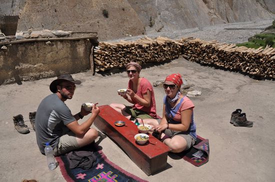 Unser wohl günstigstes Mittagessen auf dem ganzen Trek bekamen wir auf der Dachterrasse eines Einheimischen serviert, da es in diesem Ort weder Lodges noch Restaurants für Touris gab, er aber die Zeichensprache für "Happen essen" verstand Wir nahmen auf einem auf dem Boden ausgebreiteten Teppich platz und warteten gespannt, was wir wohl serviert bekommen würden. Raga Soup, hatte er gesagt. Suppe ist gut, haben wir gedacht. Raga Soup war dann eine Instant-Nudelsuppe (der Marke Raga) mit frischem Gemüse - sehr lecker!