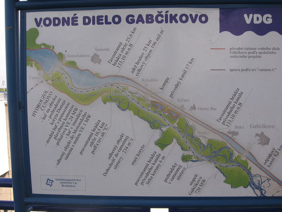 Das Ergebnis kann man in Gabcicovo bewundern: Eine  Schleuse mit 12 Meter Hub, ein 720 MW Stromkraftwerk und Deiche gewaltigen Ausmaßes, soweit das Auge reicht. Der aufgestaute Donauwasserspiegel liegt an der Staustufe 8 Meter höher als das Land auf beiden Seiten, die Deiche haben also auch bei Normalwasserstand zu verhindern, dass es Überschwemmungen dahinter gibt.
