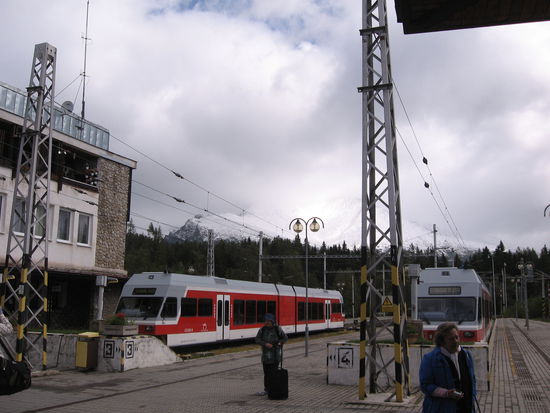 In Poprad stehen die Straßen auch unter Wasser und der Stadtrundgang wird mühsam, im übrigen ist wegen des Feiertages auch hier nichts los, also nehmen wir den nächsten Zug über die Kurorte nach Strbske Pleso zurück. Von Panorama sehen wir dabei stets das Gleiche: Sturm in den Wäldern, umgeknickte Bäume und Regen, der allenthalben die Bäche mit braunen Fluten anschwellen lässt.