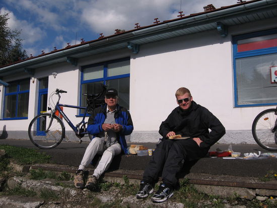 Erst nachmittags um 16 Uhr fällt uns auf, das wir noch nichts zu Mittag gegessen haben. Beim Potravinny in Hanusovce holen wir uns das Brot und können anschließend in der Nachmittagssonne vor dem Postamt Picknick halten.