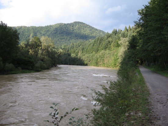 Der Dunajec hat braunes Hochwasser, die Floßstartrampen sind überflutet, es kann nicht mehr geflößt werden - zu gefährlich, sagt man uns.