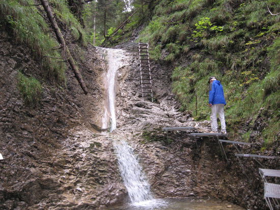 Das wird kein Spaziergang! Gut, dass wir kein Gepäck dabei haben und unsere Hände frei sind zum Balancieren oder Festhalten! Im Bett eines Baches geht es steil bergauf, und wenn Wasserfälle zu überwinden sind, führt der Weg über Holzstege oder Steigleitern. Dabei bieten sich immer neue großartige Blicke in eine wilde Natur. Dass der Bach braunes Hochwasser führt, wo sonst im Sommer das Bachbett ausgetrocknet ist, verstärkt den abenteuerlichen Eindruck nur.