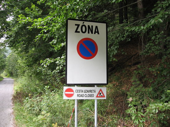 Wir finden auch die Baustelle, derentwegen die Straße gesperrt ist: Ein Erdrutsch hatte sie verschüttet und ein Team von Arbeitern hat sie gerade wieder passierbar gemacht, wir sind sogar die ersten, die die frisch asphaltierte Straße benutzen können ! Auf 1150 m Höhe ü.M erreichen wir die Passhöhe, eine Tafel weist auf den herrlichen Blick, den man hier haben soll und auf die einzigartige Vielfalt an Flora hin - wir sehen leider nur anrückende neue Regenwolken. Kurz vor dem einsetzenden Regen können wir noch talabwärts sausen bis zur Einmündung auf die Hauptstraße vom Tal des Hlinec zum Tal des Hron südlich der Niederen Tatra.