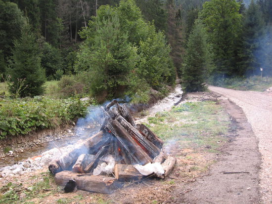 Also begutachten wir erst einmal die nähere Umgebung, und die ist romantisch genug! Waldarbeiter haben entwurzelte Bäume von der Straße zu räumen und haben mit dem Abfallholz ein großes Lagerfeuer angezündet. Von hier gehen Fußwanderwege in alle Richtungen, ein Paradies für Wanderer !