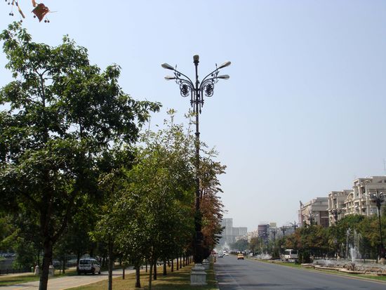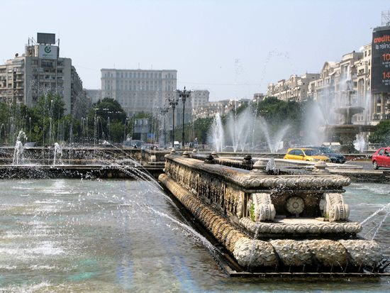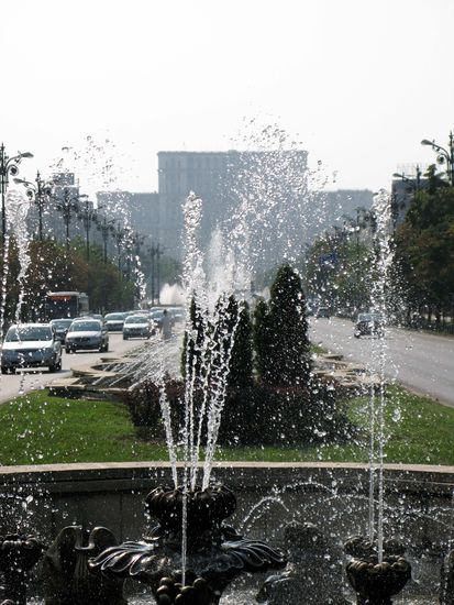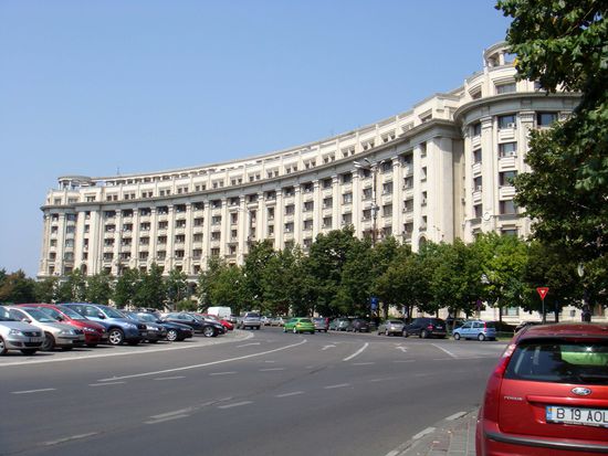 Das Thermometer in Bukarest zeigt stolze 37 °C! Die Stadt ist recht einfach zu fahren, führen doch alle Strassen direkt ins Zentrum. Wir parken gegenüber dem Gerichtsgebäude bei einer Baustelle. Die Sonne brennt, es ist heiss!