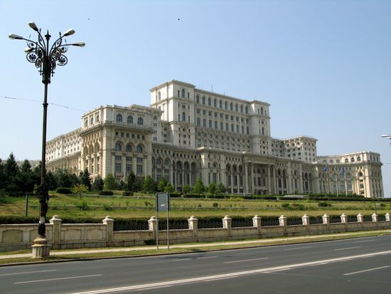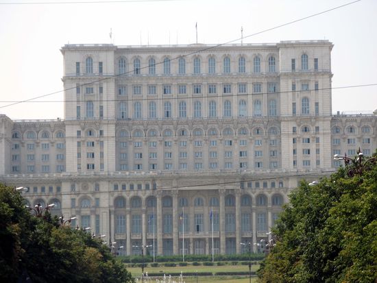 Der "Palast des Volkes" ist ein Palast der Superlative, wohl ganz im Sinne seines damaligen Bauherrn, Nicolae Ceausescu. Ganze 60 Mio € hat der Palast verschlungen seit dem Baubeinn am 25. Juni 1984. Der Machthaber war versessen, den bisher weltgrössten Bau in Nordkorea zu übertreffen, den er kurz vorher dort gesehen hat. Er liess über 70'000 Bukarester Bürger zwangsweise umsiedeln, 12 Kirchen, 3 Klöster und 2 Synagogen wurden dem Erdboden gleichgemacht. Als Vorwand für diese beispiellose Abrissaktion wurde das Erdbeben von 1977 herangezogen - "die Bausubstanz sei schlecht"! Das traditionelle jüdische Viertel gibt es nicht mehr, das historische Viertel Dealul Spirii mit seinen Gärten ist ebenso verschwunden.