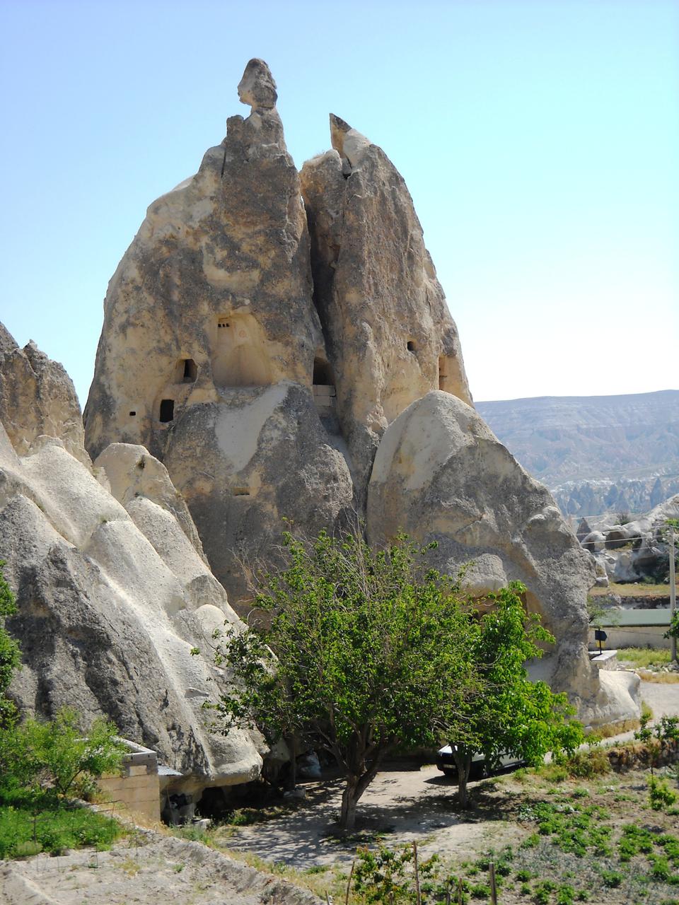Das erste Mal werd ich um 4.30 Uh wach: Durch einen verrückten Traum. Doch dann schlafe ich fest, bis uns das Handy um 7 Uhr weckt. Das Frühstück ist hervorragend. Das ganze Hotel, 2 osmanische Häuser, ist liebevoll ausgestattet und sehr gepflegt. Der Besitzer hat noch in Löhne/Deutschland ein weiteres Hotel. Erst um 9 Uhr verlassen wir die schöne Stadt. Unser Ziel heute heißt Kappadokien. Zunächst ist die Straße sehr gut. Man will uns wohl in Sicherheit wiegen. Dann folgen 4 Baustellen in einer Stunde auf 50 km. Und dann wird es wieder holprig und staubig. Eine Schlaglochpiste folgt der anderen. Wir biegen von der Autobahn ab. Erst ist es eine super Straße, dann steht ein Schild: Die Straße wird begradigt auf 20 km. Das reinste Hoppeln statt Fahren folgt dann. Auch als wir wieder auf der Autobahn sind, wird es nicht besser, sondern schlechter. So machen wir nach 240 km um 13.30 Uhr erst einmal eine Teepause. Die Landschaft, die wir durchfahren, ist sehr schön, bergig, mit mehreren Pässen und weiten windigen fruchtbaren Hochebenen. Die Berge sehen aus wie gefaltet. Nach Sarkisla wird die Straße gut und wir können mit 90 km/h fahren, statt wie bisher nur mit 30 km/h durch die Gegend hoppeln. Die hohen schneebedeckten Berge hinter Kayseri liegen in den Wolken und der Himmel wird dunkler und dunkler. Regen droht. Kayseri liegt auf 1.054 m am Fuße des erloschenen Vulkanes Erciyes (3.891 m), der mit seinen Ausbrüchen für die Tuffstein-Schichten in Kappadokien verantwortlich war. Rolf verlässt die Straße, es geht Richtung Nevsehir. Das Wetter wird schöner, die Sonne scheint wieder. So erreichen wir gegen 16.15 Uhr Uchisar in Kappadokien, wohl einer der schönsten Orte, wo der Burgfelsen wie ein Emmentaler Käse durchlöchert ist. Hier haben aus Frankreich zurückgekehrte Türken begonnen, die malerischen Felswohnungen zu restaurieren und in schöne Unterkünfte zu verwandeln. Hier wird viel Französisch gesprochen. Uchisar hat sich seine reizvolle ursprüngliche Atmosphäre bewahrt.