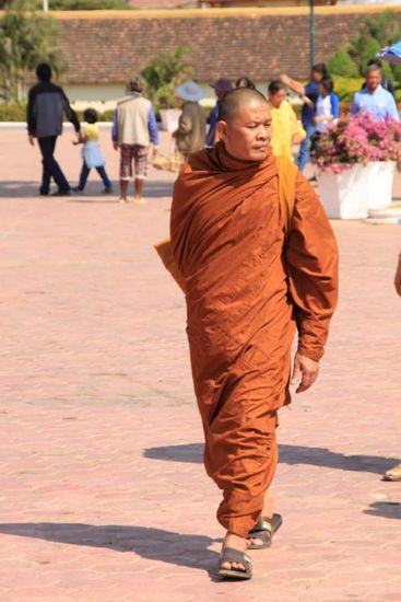 Es ging weiter. Wir waren doch noch zu diesem Zeitpunkt etwas genervt und hatten grad so gar keine Einstellung zu Stadtrundgängen. Das vor uns stehende Denkmal zu Ehren des letzten Königs des Königreichs Lane Xang (das bedeutet Million Elefanten), war auf keiner Karte zu finden. Immerhin hatten wir das Mekongufer auf unserer spärlichen Karte entdeckt. Gut. Die Promenade am Flussufer macht noch nicht viel her, aber das wussten wir schon, da hier eine riesige Baustelle bis 2013 ist. Uns wunderte nur die grimmig dreinschauende militärische Präsenz, die schwer bewaffnet, um das Denkmal patroulierte. Wir kamen ins Grübeln, immer noch von der "Auseinandersetzung" mit dem armen Tuk Tuk Fahrer beeinflusst, ob wir denn etwas einheimische Währung abheben sollten. Wir befanden es für sinnvoll, wollten aber unsere VisaCard nicht mit den Kartenautomaten benutzen, da hier extrem hohe Gebühren anfallen für ausländische Karten, auch für die sonst verwöhnten DKB-Kunden. Unsere Ausdrucke verrieten uns, dass es wohl einen Automaten gäbe, der ohne Gebühren Geld ausspuckt. Den suchten und erfragten wir vergebens. Sprachlich kommt man hier mit Französisch deutlich besser weiter als mit Englisch. Wenn man Glück hat erwischt man einen Einheimischen, der in der damaligen DDR studiert hat. Der kann dann etwas deutsch. Geld erhielten wir für unsere restlichen US-Dollar, die wir nun nicht mehr benötigten, da das Visum ja gezahlt war, beim Money-Changer. Nun hatten wir also 128.000 Kip und wussten gar nicht, was wir damit tun würden? Wir liefen einfach erst einmal los. Hmmm...Nüscht los hier. Eher wie ein Dorf. Zum Teil gibt es ein, zwei Straßenzüge, die ganz nett sind, aber das war's auch schon. Die Hoffnung auf Besserung trieb uns weiter. Um es vorweg zu nehmen. Es kam nichts weiter. Es gibt in der etwa 350.000 Einwohner fassenden Hauptstadt recht wenig zu sehen. Uns wurde recht schnell klar, dass wir hier wohl nicht den ganzen Tag verbringen würden.