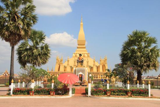 Und schon wandelte sich das Blatt ein wenig. Mit den Rädern kamen wir natürlich viel besser vorwärts und beschlossen, den angeblich nachgebauten Triumpfbogen zu besuchen. Es dauerte auch nicht lang und wir fuhren die mehrere Km lange "Pracht"-Allee (nur dass da links und rechts an der breiten Straße nicht wirklich viel stand) gen Triumpfbogen, der mächtig vor uns aufragte. Immerhin ist es keine 1:1 Kopie sondern ein asiatische Variante geworden, wenn auch aus finanziellen Nöten heraus nie ganz fertig gestellt. Etwa 2km weiter sollte dann der größte und prachtvollste Chedi und Wat der Stadt stehen. Auch hier traten wir kräftig in die Pedale und erreichten diesen in der prallen Mittagshitze schweißgebadet. Ok. Er ist schon groß, sieht von weitem auch toll aus. Aber wo sind denn hier bitte die Besucher? Scheint keinen zu interessieren, dabei soll das das Nationalheiligtum sein. Aber das passt auch wieder zu der Stadt. Irgendwie will alles nicht so richtig zusammenpassen, was vielleicht auch an der kommunistischen Ausrichtung des Landes liegen mag. Wir Ossis kennen das ja auch noch ein bisschen aus der DDR. Prestigeobjekte wurde ohne Wenn und Aber gefördert und der Rest machte so vor sich hin. Überall hängen 2 Fahnen rum: die laotische Flagge und die der demokratischen Einheitspartei (mit Hammer und Sichel...) Interessant auch folgende Dinge, die wir im Reiseführer gelesen haben: auf dem Hauptplatz der Stadt steht ein riesiger Brunnen, der ist aber nur zu ganz besonderen Anlässen an, weil sonst das Geld dazu fehlt. Und von den Chinesen hat Vientiane eine tolles Haus, eine Art Kulturhalle oder sowas geschenkt bekommen, nur steht es leer und wird nicht benutzt - kein Geld.