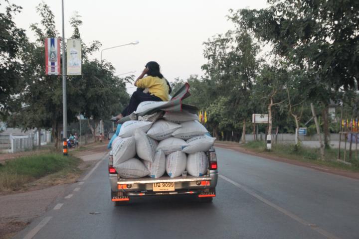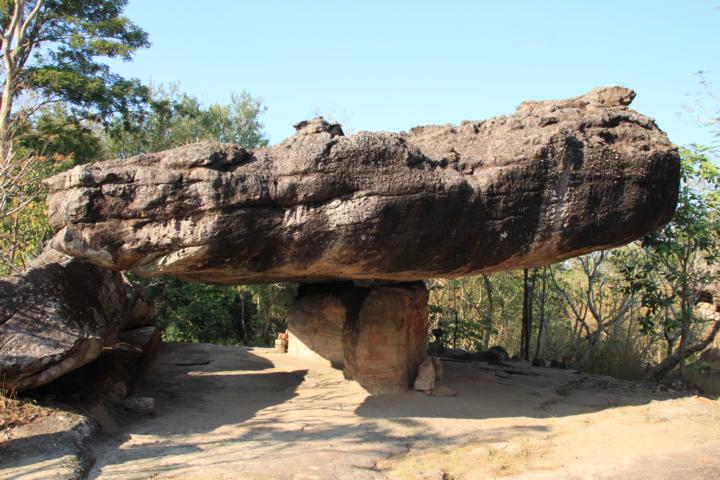 Die Weiterreise führte uns nach Si Chiangmai, einem kleinen verschlafenen Ort am Mekong. Dort bogen wir zum Ufer des Mekong ab und hatten plötzlich die komplette "Skyline" von Vientiane vor uns. Hier ist man der laotischen Hauptstadt im Prinzip am nächsten und direkt gegenüber. Sonst ist hier aber auch nix weiter los. Weitere 30km später erreichten wir unser vorläufiges Ziel, den Phu Phrabat Historical Park. Ein Schlagbaum hinderte uns zunächst vor der Weiterfahrt. Nach Zahlung von 200 THB Eintritt ging's dann aber weiter eine hügelige und kurvige Straße entlang bis zum Parkplatz. Dort waren wir wieder einmal die einzigen weit und breit. Wir stiegen trotzdem aus und standen nach einem kurzen Fußmarsch vor mehreren seltsam bizarren Steinformationen, die die Natur über Jahrtausenden geschaffen hatte. Höhlenmaleren gab's auch, die schon 3000 Jahre alt sind! Die Steinkolosse auf den schmalen Stützen liegen im dichten Urwald überall verstreut, sind aber durch viele Schilder gut zu erreichen und zu bestaunen. Nach etwa einer Stunde kehrten wir ziemlich von Mücken zerstochen zum Auto zurück und setzten die Fahrt Richtung Tha Bo und unserem Guesthouse für diese Nacht fort. Dabei sind wir voll durch die "Pampa" gefahren, also durch Minidörfer, geprägt von Landwirtschaft und sonst ist auch einfach gar gar nichts los. Scheint ein recht hartes Leben zu sein, die Menschen (auch die Kinder schuften schon mit) stehen bei glühender Hitze auf dem Feld und machen alles per Hand. Schweres Gerät ist hier Fehlanzeige.
