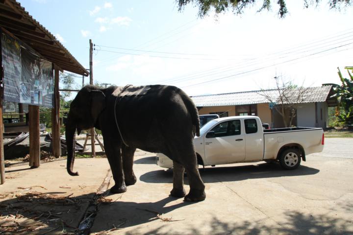 Im Prinzip haben wir heute nicht so viel getan, außer die Seele baumeln zu lassen. Es begann mit einem Frühstück, das wir noch nie so gut, würde ich behaupten, genossen haben. Hendi suchte sich ein Müsli mit frischen Früchten aus. Klingt zunächst unspektakulär, wenn man aber dazu weiß, dass dieses unglaubliche 30! Zutaten enthält und natürlich selbstgemacht ist, dann hört sich das schon besser an. Wir wissen zum Teil gar nicht, was genau da alles drin war. U.a. auf jeden Fall einige Früchte, diverse Körner, Popcorn, Leinsamen, Sesam, eine Art Minzjoghurt, einige Sorten an angeröstet Nüssen und und und... Marco bestellte sich ein im Prinzip simples Omelette. Das war dann schon eher ein Gemüseauflauf, der mit Ei zusammen gehalten wurde und im Bananenblatt gebraten wurde. Echt klasse. Gekrönt wurde das Essen durch zwei Shakes. Einen Mango-Passion-Fruit-Shake und einen Minze-Ingwer-Limonen-Shake. Der war erst minzig erfrischend und dann kam die Schärfe des Ingwer. Eine tolle Kombination, die daheim auch leicht selbst nachzubasteln ist. So saßen wir also und schlemmten und genossen den Blick auf die Berge, vor uns das leise Plätschern des kleinen Sees... Aber genug vom Frühstück. Nun war es fast Mittag und wir wollten nicht komplett untätig herumsitzen. So zogen wir los und schauten uns die Stadt einmal komplett an, nicht nur die drei bis vier Straßen vom täglichen Nachtmarkt. Wir stellten fest, dass hier die Zeit am Tage still steht und in der Nacht dann etwas in Schwung kommt, aber bitte nicht zu viel Hektik. Es war interessant, die kleinen Nebengassen zu erkunden, dem Alltag der Menschen zuzuschauen, einfach über die einheimischen Märkte zu spazieren. Nun ist der Ort nicht sonderlich groß und wir entschieden kurzerhand, noch ein wenig mit dem Auto die nähere Umgebung abzuklappern. Zunächst ging es auf der Straße hinter unserem Guesthouse weiter, die man nach etwa 2-3 km in Elefant-Riding-Street umbenennen kann. Auf dem Weg dahin haben wir denn doch noch eine ordentlich große Schlange gesehen, wie sie sich recht flink vor unserem Auto quer über die Straße schlängelte. Die war dann schon eher arm dick und erreichte die Länge einer halben Straßenbreite. So einem Tierchen wollten wir nicht zwingend ohne Schutz unseres Autos begegnen.