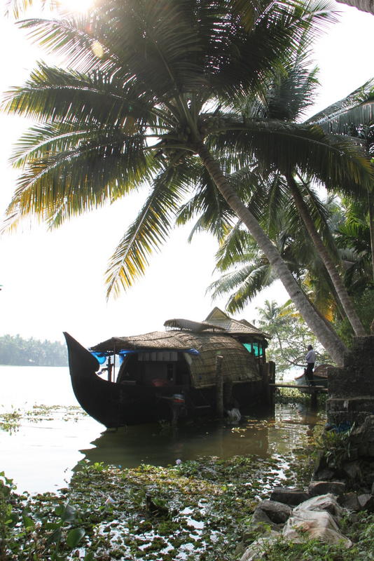 Bevor es losgeht suchen wir uns ein Restaurant um zu Frühstücken. Durch die Suche und das etwas längere Warten auf das Essen kommen wir etwas zu spät an dem Treffpunkt beim Tourist Desk in Fort Kochi an. Von dort geht es mit dem Auto zum Fluss. Wir können uns noch mit Wasser, Keksen etc. versorgen und steigen in eines der 3 Kanus, die am Ufer warten. Wir werden zu einer türkischen Familie und 2 weiteren Türken zugeteilt, mit der wir ein Kanu teilen sollen. Zu der indischen Familie sollen wir nicht, da der Guide meint, es wäre für uns nicht angenehm, da diese immer sehr laut sind. Es gibt einige Diskusionen an Land. Anscheinend fehlt noch jemand, der direkt hierher kommen wollte. Es taucht niemand mehr auf aber wir müssen los. So bleibt die komplatte Familie zurück. Wir haben Glück und sind damit nur zu viert mit einem Ruderer auf dem Kanu. Es geht durch kleine Kanäle zu einer Familie, die am Ufer lebt. Hier gibt es ein Päuschen mit einer Tasse Tee. Gruppenfotos werden noch schnell gemacht und es geht weiter den Kanälen entlang zu einem kleinen Dorf in dem Schnüre hergestellt werden. Zurück am Startpunkt fahren wir mit dem Auto zu einem Hausboot auf dem es Mittagessen gibt. Mit diesem Boot geht es dann auch weiter auf der Hauptwasserstrasse. Nach kurzer Fahrt kommen wir zur einzigen Stelle in den ganzen Backwaters von der aus man Kochi, Ernakulam und Kumarakom gleichzeitig sehen kann. Wir befinden uns noch im Süsswasser der verschiedenen Zuflüsse. Weiter vorne kommen wir in den Bereich wo sich das Süsswasser durch Ebbe und Flut mit dem Salzwasser aus dem indischen Ozean vermischt. Vorangetrieben vom 10 PS Aussenbordmotor geht es gemütlich durch die breiten Wasserflächen vorbei an kleineren und grösseren Inseln, die teilweise nur von (Nutz-) Tieren bewohnt werden, teilweise über eine komplette Infrastruktur, angefangen bei der Wasserversorgung bis hin zu Schulen, verfügen. Wir besichtigen eine Gipsfabrik, in der aus Muscheln Kalk gewonnen wird und sehen -etwas weiter wie Palmwein gemacht wird - inkl. Degustation natürlich. Dazu kann man sich auch dank dem heutigen guten Fang der Fischer Muscheln zubereiten lassen, die man in ein Palmblatt verpackt als Snack mit auf`s Boot nehmen kann.