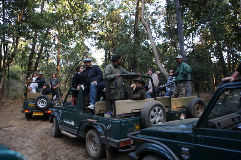 Ausgeschlafen frühstücken wir um 11.00 h im Garten am Pool in der Sonne und sind um 14 h bereit zur Safari. Schon auf dem Weg zum Eingang sind überall riesige Ameisenhügel am Strassenrand. Zusammen mit Fahrer, Guide und Artie aus Amerika fahren wir im Park verschiedene Punkte an, an denen kürzlich Tiger gesehen wurden. Wir finden aber nur Fussabdrücke von einem Tigerweibchen (haben längere Zehen als die Männchen). Wir bleiben nochmals stehen und horchen aber es gibt keine Laute von anderen Tieren und auch keinen Tiger weit und breit. Dafür sehen wir einige Hirsche, Affen, Vögel, Pfauen und auch neu: Wildschweine. Wir bekommen ein gutes Bild von einem Sambarhirsch. Ziemlich spät hören wir einen Warnruf von so einem. Wir fahren hin, aber es rührt sich nichts. Auf dem Rückweg zum Ausgang sind sehr viele Jeeps unterwegs und es ist seeeeehr staubig. Nach der Fahrt bekommen wir wieder ein warmes nasses Tüchlein und einen Tee.
