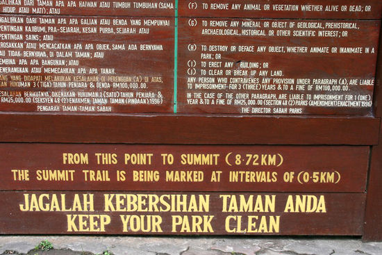 Man kauft sich eine Package für Unterkunft und Verpflegung bei der zuständigen Agentur (Sutera) und fährt dann im Kleinbus die 2 Stunden zum Park. Erhält dort ein Lunchpaket, muß die Erlaubnis um den Berg zu Besteigen kaufen, dann einen Guide aussuchen und bezahlen und dann geht es die 6 Stunden zum Laban Rata Haus auf etwa 3 800 m Höhe. Dort bekommt man Abendessen und ein Matratzenlager und für Unerschrockene bietet sich eine kalte Dusche an.