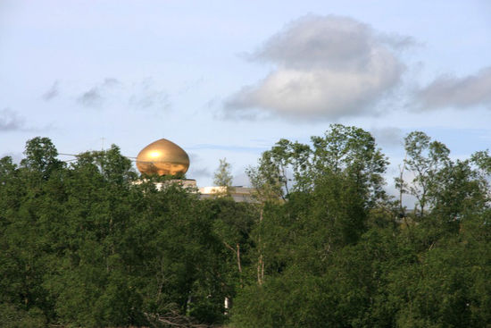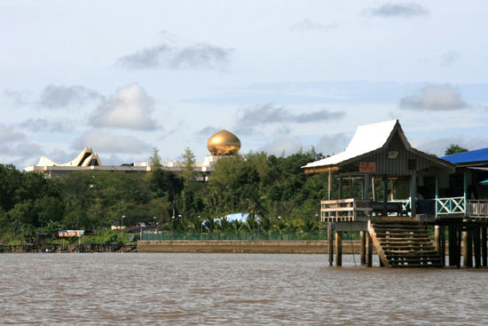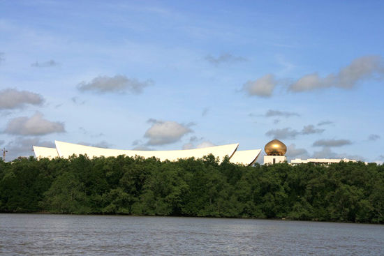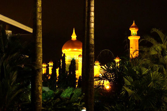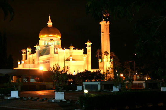 Auf den ersten Blick ist vom Reichtum nicht viel zu sehen. Über dem Stadtbild ragen die Prunkbauten der Moscheen. Vor allem die Goldkuppel der Omar-Ali-Saifuddin-Moschee und der Sultan-Hassanal-Bolkiah-Moschee. Die Goldkuppel am Horizont gehört zum Sultanspalast, dort wohnt der Sultan mit seinen beiden Frauen und den neun Kinder. Es ist mit seinen 1800 Zimmern das größte Wohnhaus der Welt. Leider konnten wir nicht rein, aber an 3 Tagen im Jahr - immer nach dem Ramadan - wird jeder Bruneier dort bewirtet. In dieser Garage stehen wohl 300 Fahrzeuge und der Sultan fliegt seine Maschine schon mal selber, wenn er weg will. Renten, Gesundheitsfürsoge, all das ist für die Bürger Bruneis kostenlos. Der Sultan teilt seinen Reichtum mit den Bürgern des Staates, vor allem dann, wenn sie Moslems sind. Hier wird dieser konservativ gelebt und selbstverständlich gibt es hier keinen Alkohol und selbst die Stewardessen der Fluglinie tragen Kopftücher.