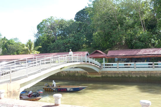 Nun fangen wir an, Stempel für unseren Reisepass zu sammeln. Erste Grenze, Sabah - Sarawak. 2 Stempel werden fällig. Nächste Grenze: Sarawak - Brunei. Wieder 2 Stempel. 3.Grenze ist dann Brunei - Sarawak, was wiederum 2 Stempel ergibt. 4. Grenze ist Sarawak - Brunei, wir bekommen weitere 2 Stempel und haben die stattliche Anzahl von 8 Stempeln im Pass. Nicht zu vergessen, an jeder Grenze waren 2 Formulare auszufertigen. Fast hätten wir es vergessen, zwischen Sarawak und Brunei durfte der Bus mittels Fähre einen Fluß überqueren. Vermutlich ist man sich über den Brückenbau noch nicht einig. ......und das kann dauern!
