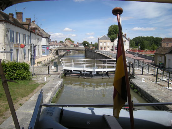 Im Schifferdorf St. Mammés trifft die Loing auf die Seine. Doch es ist dem Bootsfahrer nur ca. zwei Kilometer gegönnt, auf dem kleinen Fluss zu fahren. Bereits an dem wunderschönen mittelalterlichen Ort Moret-sur-Loing beginnt der Kanal und die Loing schlängelt sich völlig naturbelassen nebenher. Unsere erste Schleuse, Schleuse 19 Moret, wird von einem Schleusenmeister bedient. Oberhalb der Ecluse 18 Bourgogne ist ein Lidl für einen nahen Einkauf. Der Kanal ist ein in fast 300 Jahren in die Landschaft eingewachsener Wasserweg und in tadellosem Zustand. Teils schlängelt er sich durch Baumalleen, teils an den Hinterhöfen und -Gärten von Ortschaften vorbei. Nicht nur der Kanal ist in einem sehr guten Zustand, auch die Dörfer machen einen freundlichen, gepflegten Eindruck. Es gibt recht viele Industriebetriebe, und deshalb kann man durchaus einigen Penischen begegnen. An einigen Stellen ist der Kanal breit wie eine Großschifffahrts-Straße. Begegnung mit der Berufsschifffahrt ist kein Problem.