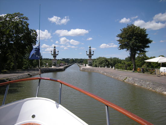 Zwei Kammern klettern wir aufwärts, um direkt in einem schönen 18bogigen, 343 m langen Aquädukt die Allier zu überqueren. Der atemberaubende Anblick eines wilden Flusses öffnet sich uns.