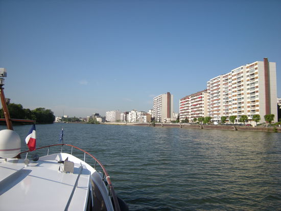 Wir befahren die Haute-Seine von Paris bis zur Yonne und haben auf dieser Strecke acht Schleusen. Unsere Reise beginnt am Sportboothafen Paris Arsenal. Auf den folgenden knapp fünf Kilometern bis zur Mündung der Marne überspannen uns nicht weniger als zehn Brücken. Wohn-Penischen liegen am Ufer. Alte, vergammelte Boote, Frachtschiffe, Hotelschiffe, Restaurantschiffe. Ich bin ein bisschen erschöpft von all den Eindrücken, als wir unsere erste Schleuse, Port-á-l'Anglais 10, erreichen. Die Seine leidet hier an einer Überdosis Beton. Im Einzugsbereich von Paris ist sehr viel Industrie. Ein Kohlekraftwerk, Müllverbrennungsanlage, Silos, Mühlen, Sandbetriebe. Die Ufer zugepflastert mit Wohnschiffen. Hochhäuser, sogar ein Neubauviertel.