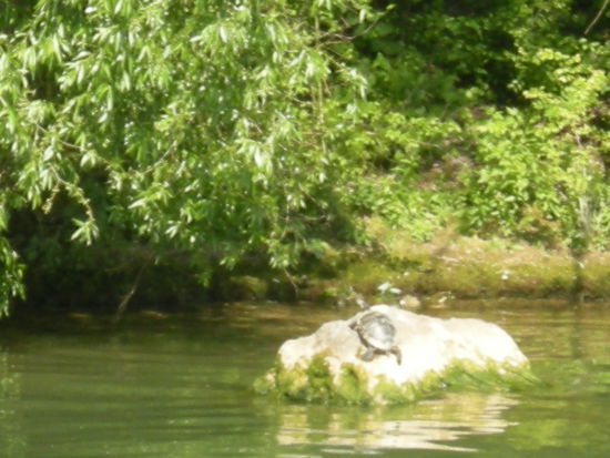 Es wird etwas freundlicher, und wir entschließen uns, im Port aux Cerises eine ruhige Nacht zu verbringen. Es sollte sich jedoch herausstellen, dass die Nacht alles andere als ruhig wird. (Beluga in Gallien) Auf unserem weiteren Weg zeigt sich neben dem Fluss immer noch das gleiche Bild, Hochhäuser, Wohnschiffe, Industrie, dazwischen viele Bäume und auf dem Fluss unheimlich viel Verkehr. Aber auch die ersten gelben Teichrosen und irgendwo auf einem Stein sonnt sich eine Schildkröte.