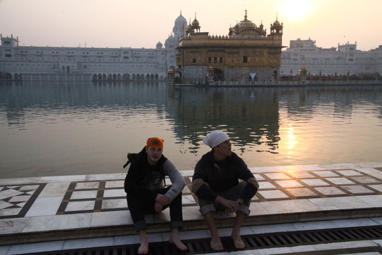 Nachmitags kommen wir in Amritsar an und finden per GPS schnell das empfohlene Bandaris Guesthouse. Hier können wir schön in Ruhe stehen und Duschen benutzen. Mit der Rikscha fahren wir in die Innenstadt zum Geld abheben und weiter zum goldenen Tempel. Allerdings müssen wir hier den Kopf bedecken- obwohl ich es wusste habe auch ich es vergessen und so lassen wir uns irgendwelche schmuddeligen Tücher andrehen von Verkäufern, die extra dafür auf der Straße stehen. Vor dem Tempel lassen wir uns noch je einen Burger braten. Die sind halt sehr scharf und basieren auf irgend einer Kartoffelgemüsemischung- vorzüglich. Vor dem Tempel müssen Schuhe und Rucksäcke abgegeben werden und durch ein Fußbad kommen wir ins Innere.