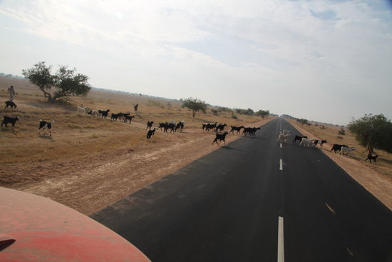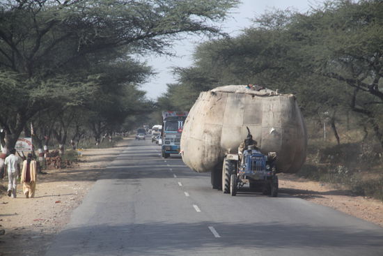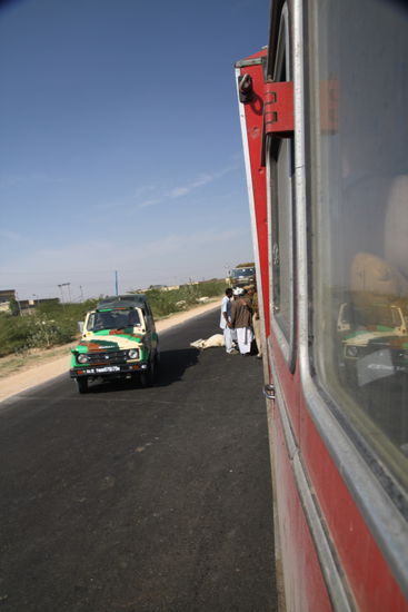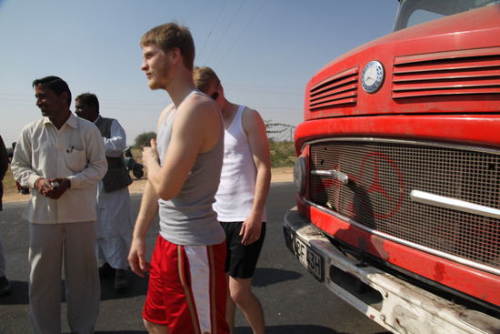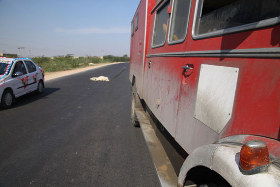 Etwas südlich von Jaisalmeer fahre ich gerade aus einer Ortschaft raus und ein Stück vor uns trottet eine Kuh über die Straße, nichts Ungewöhnliches. Als wir kurz vor der Kuh sind macht sie aus dem Nichts einen Satz und rennt auf die andere Straßenseite zurück- uns genau vor die Räder. Ich weiß nicht wie, aber ich schaffe es gleichzeitig zu bremsen und beide Drucklufthupen zu drücken- doch das konnte das Heiligtum nicht retten. Ein dumpfer Schlag und ein leichter Ruck. Lustigerweise stelle ich so schon erleichtert fest, dass nichts Wichtiges kaputt sein kann. Nicht so lustig ist was ich von draußen sehe. Hinter (?!) dem rechten Vorderrad liegt eine Kuh unterm LKW. Martins Gesicht aus der Beifahrertür war auch bemerkenswert und irgendwie nicht fröhlich. Zuerst müssen wir von dem blöden Sch***Vieh runter.