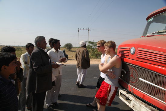 Nachdem das geschafft ist stehen wir zum einen am Rand und sind zum anderen auch gleich von der obligatorischen Menschenmenge umringt, die dieses Land in Sekundenfrist auf jede beliebige Stelle ausspeien kann, und sei es mitten in der Wüste. Etwa zwölf Inder rufen zeitgleich die Polizei an, und irgendwie merkte man eindeutig, dass ihnen allen die Kuh völlig egal ist. Es geht einfach nur um Rechthaberei und Profilierung, weil wir Schwierigkeiten kriegen (sollen).