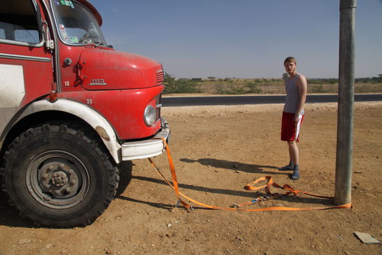 Letztendlich zahlen wir nach zwei Stunden mit blöden Debatten an die absolut trägen Polizisten 3000 Rupies (EUR50,-) und sind alles inklusive Kuh los und können fahren. Allerdings nur 500m, dann halte ich am Rand und an einem Strommast ziehen wir mit einem Spanngurt Stoßstange und Kotflügel wieder einigermaßen gerade.