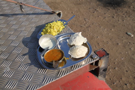 Irgendwo an der Straße gibt es mein erstes Thali, ein Teller Reis mit vielen kleinen Vertiefungen für Soßen und Suppen dazu. Sehr gut und lächerlich günstig.