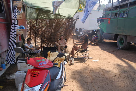 Nach dem Frühstück machten wir uns daran, ein Sonnensegel zu spannen und mit Palmwedeln eine kleine Trennwand zu bauen. Aus Kanistern und einer Pinnwand entstand ein kleiner Tisch und mit unseren drei Klappstühlen war unser Wohnzimmer perfekt. Den Rest des Tages verbrachten wir im Meer oder mit Gesprächen mit den anderen Reisenden. Bei einer dieser Unterhaltungen ging es darum einen Konvoi zu bilden und durch China zu fahren. Nun eröffnete sich für uns die Möglichkeit zu unserer ursprünglichen Route zurückzukehren und wir beschlossen, uns der Gruppe anzuschließen. Letztendlich werden es mit uns 5 Fahrzeuge sein die durchs Reich der Mitte bis nach Kyrgistan fahren: wir, drei schweizer Pärchen und ein Österreicher.