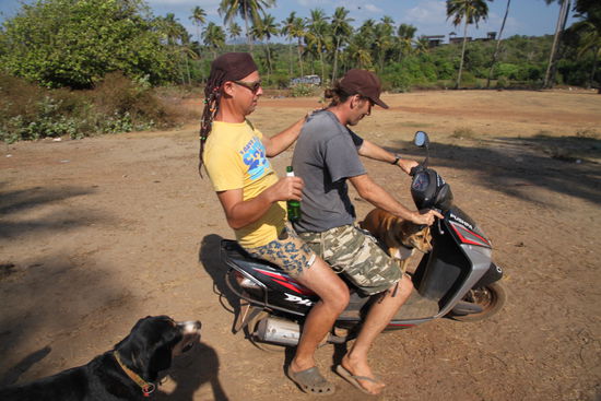 Da wir aber auch andere Dinge in der Umgebung zu erledigen hatten, wie Wäsche zum Waschen bringen oder zum Geldabheben in die nächst größere stadt mussten, mieteten wir uns für umgerechnet ca €2,50 am Tag einen Roller. Dieser erwies sich in den nächsten drei Wochen als äußerst nützlich und sei es nur zum Wasserholen am nahegelegenen Brunnen oder dem Transport von Paletten voller Dosenbier (Alkohol ist indienweit in Goa am billigsten und unser Vorrat für die Reise gen Norden sollte gesichert sein). Oft fuhren wir, ganz indisch, zu dritt auf dem kleinen Scooter, was auf dem sandigen Untergrund gar nicht so einfach war, doch wir erreichten immer sicher unser Ziel.