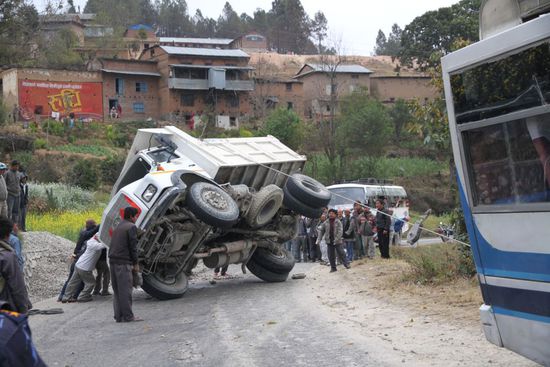 Auf dem Weg zum Sun Koshi River sahen wir dann einen Unfall. Ein (zu)vollgeladener Kieslaster war in einer Kurve einfach umgekippt und ein Stau bildete sich in beide Richtungen. Innerhalb weniger Minuten war die Straße voller Schaulustiger, denn der LKW sollte mit Hilfe eines Busses wieder aufgerichtet werden. Das wollte sich natürlcih keiner, auch wir nicht, entgehen lassen. Ein Stahlseil wurde am Laster befestigt und mit der Winde des Busses (warum auch immer ein Reisebus über eine Winde verfügt) auf seine Räder gekippt. Lustigerweise drückten von der anderen Seite eine Handvoll Nepali um das Aufrichten zu beschleunigen. Nach ca 20min war alles erledigt und für uns gings weiter.