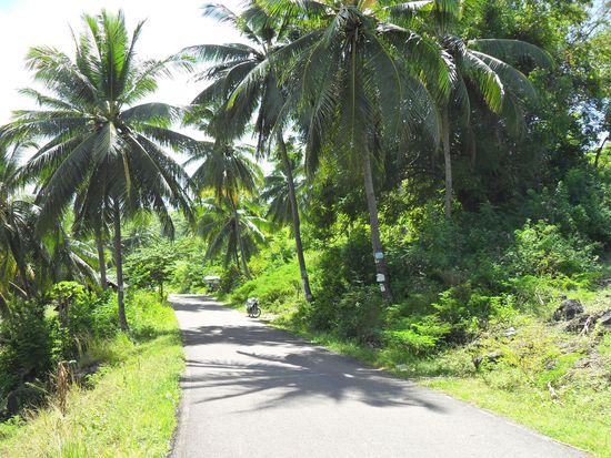 Ich erkunde aber nur die Hauptstraße, ich will nämlich weiter nach Badian, 10 km entfernt. Dort soll es einen sehr schönen Strand geben und auch wenn ich, wie gesagt, kein Strandanbeter bin, kann man ja mal schauen. Die Fahrt geht über eine gute Straße schnell vonstatten. Die Umgebung bleibt so angenehm, wie zuvor. Einem Schild folgend fahre ich eine kleine Straße Richtung Badian Beach. Die Straße führt von oben herab und bietet schon bei der Anfahrt einen schönen Panoramablick auf den gesamten Bereich. Unten angekommen zeigt sich ein Strand, wie man ihn auf Werbebroschüren abbildet, langgezogen und weiß. Ich laufe ihn ein wenig entlang, er ist fast menschenleer. Es gibt zwar ein paar Unterkünfte am Strand, aber außer mir und drei Fischern ist weit und breit keiner zu sehen. Liegt vielleicht auch daran, dass es kurz vor Mittag ist und die Sonne hämmert. Ich wollte ja auch nur mal schauen.
